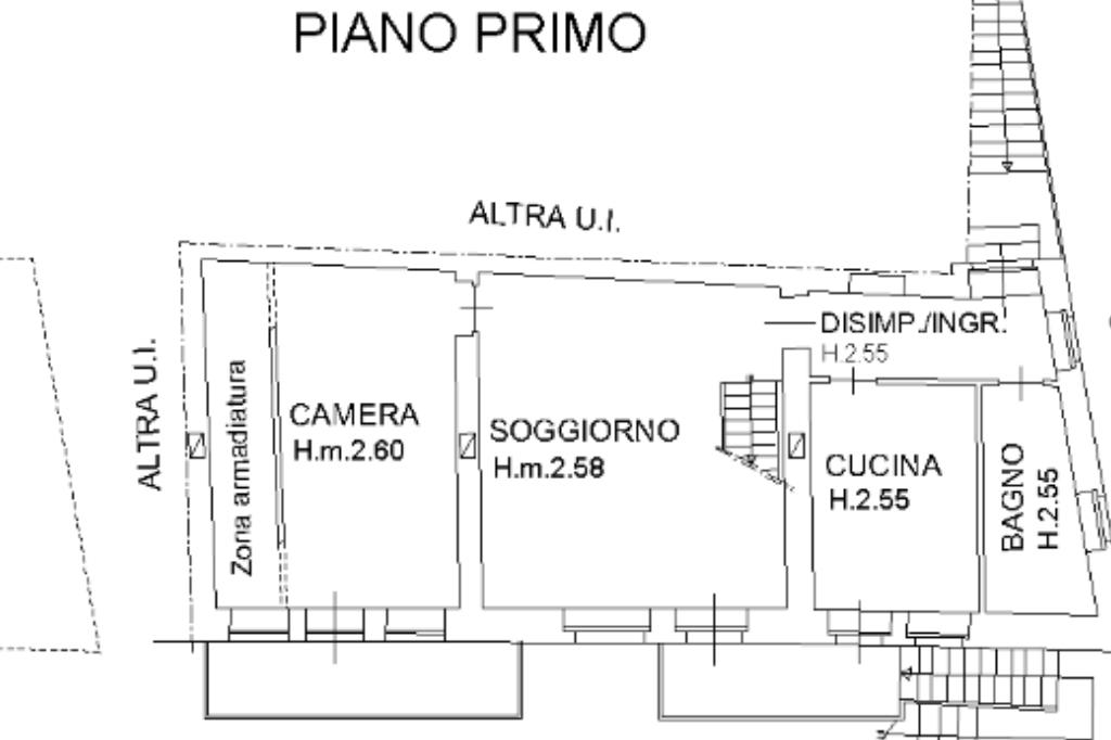 Al piano terreno ingresso su un disimpegno con bagno adiacente. Ampio salone e un locale uso camera/studio.